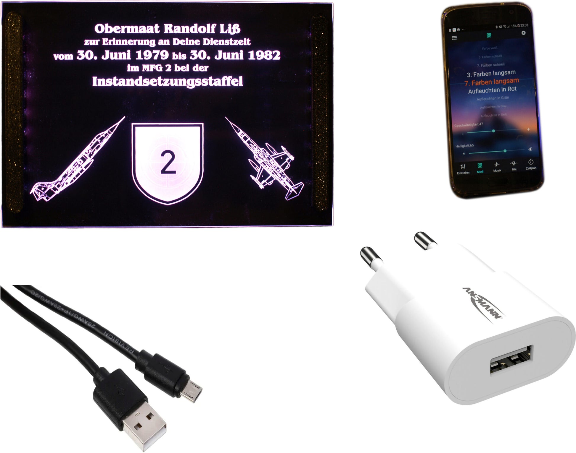 Du kannst zwischen verschiedenen Größen wählen und das Leuchtbild entweder mit Standfüßen aufstellen oder mit einer Wandhalterung montieren. Die Stromversorgung erfolgt bequem über ein USB-Steckernetzteil.