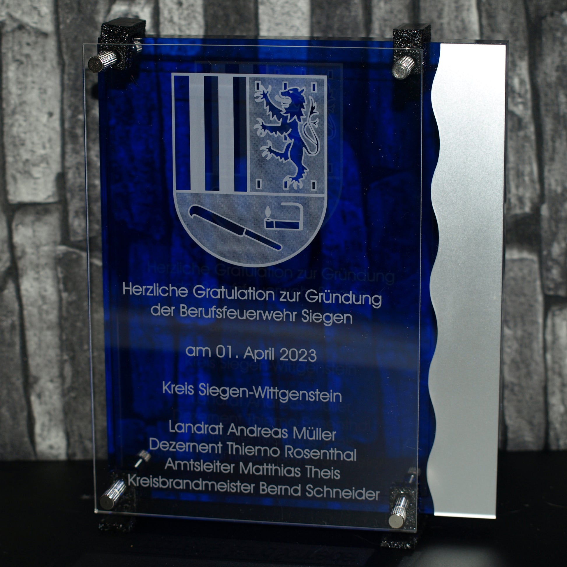 Hier lohnt das genaue Hinsehen: Ein tiefblaues Rechteck, eingefasst von einer Ice-farbenen Welle, bildet den Hintergrund für eine klare Acrylplatte, die mit silberfarbenen Abstandhaltern aufgeschraubt ist. Ein displayähnlicher Award der Extraklasse.